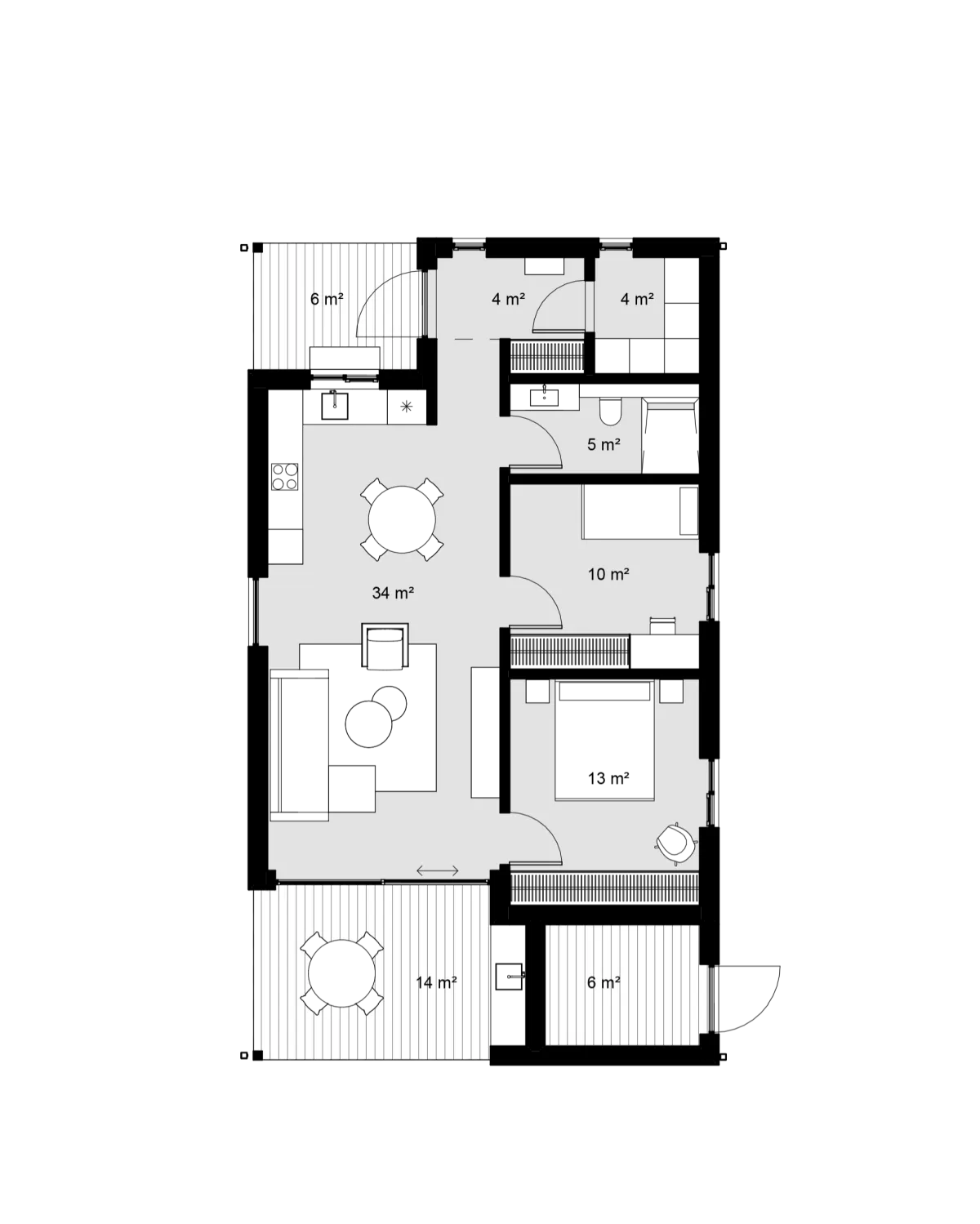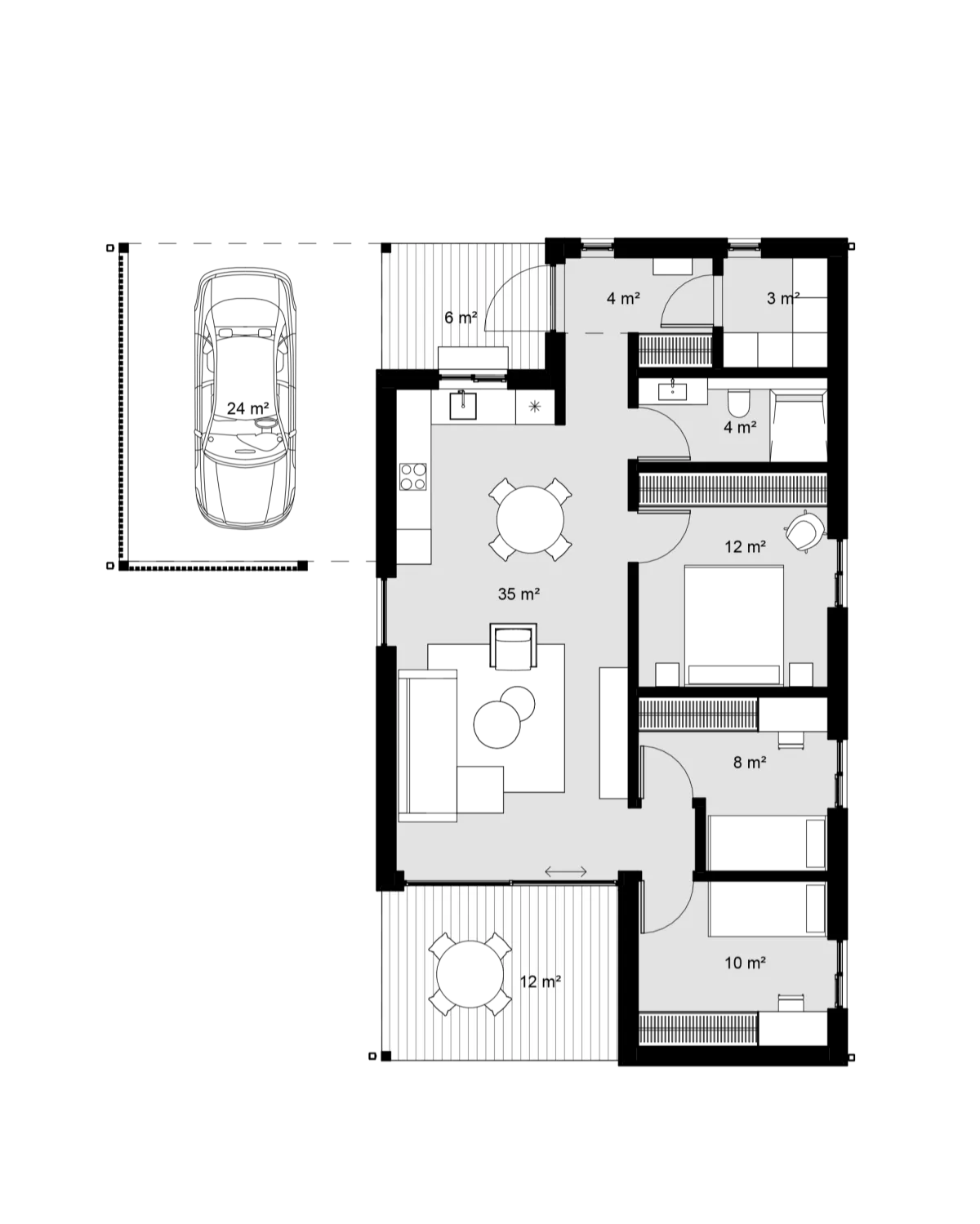 Plānojums piedāvā izvēli starp trim guļamistabām vai divām guļamistabām ar integrētu āra noliktavu, pielāgojoties dažādām dzīves vajadzībām. Papildus katram plānojumam ir iespējams pievienot auto nojumi.